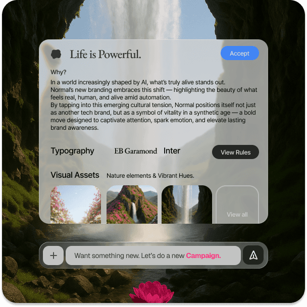 From strategy to shipment. don’t just generate static images-edit, animate, and refine them in real-time. Normal acts as your creative partner, turning campaign ideas into tasteful content.